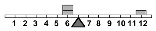 Per equilibrare l'asse graduata si può spostare uno dei due gettoni posti a sinistra del perno a distanza maggiore dal centro e più precisamente dalla posizione 6 alla posizione 2, in modo che nella configurazione finale sia verificato l'equilibrio dei momenti:
