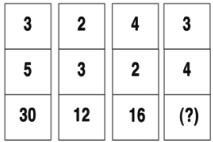 Nella serie numerica figurale proposta i 3 numeri contenuti in ogni colonna sono legati dal seguente criterio logico-matematico: partendo dall'alto, il doppio del prodotto del primo e del secondo numero è uguale al terzo numero.