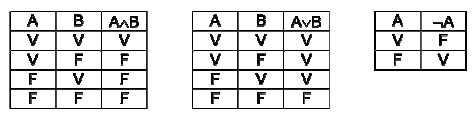 Le tavole di verità sono tabelle usate nella logica per determinare se, attribuiti i valori di verità alle proposizioni che la compongono, una determinata proposizione è vera o falsa. Le tabelle di verità della congiunzione “e” (), della disgiunzione “o” (∨) e della negazione “non” (¬) sono rispettivamente: