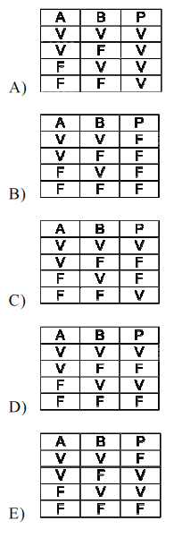- terza riga: "A" è falsa e "B" è vera → dalla terza riga della "tabella A∧B" si ha che "A∧B" è falsa, quindi "non (A∧B)" è vera → poichè "non (A∧B)" è vera e "A" è falsa → dalla seconda riga della "tabella AB" si ha che "P" è vera. La terza riga non è quindi corretta.
