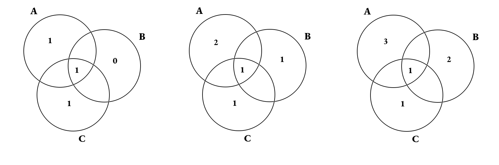 Poichè, però, l'elemento inserito nell'intersezione dei 3 insiemi appartiene anche ad A, si deduce che gli elementi che appartengono solo ad A possono essere 1, 2 o 3, altrimenti si supererebbero i 4 elementi previsti.
