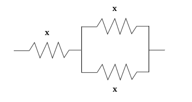 Sia R1 la resistenza equivalente ad una connessione di tre resistenze uguali di valore x di cui una è connessa in serie con le altre due connesse in parallelo; sia R2 la resistenza equivalente ad una connessione di tre resistenze uguali di valore y di cui una è connessa in parallelo con le altre due connesse in serie. Quale relazione deve intercorrere tra x e y in modo che R1 = R2?