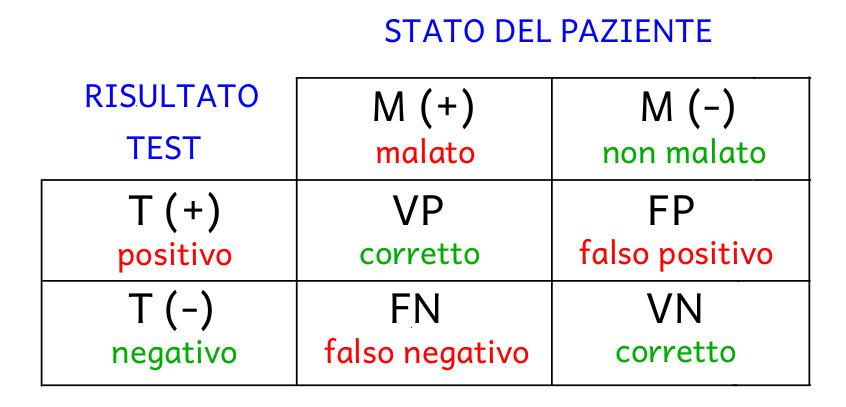 - falsi positivi (FP): numero di individui sani (non malati) e positivi al test;