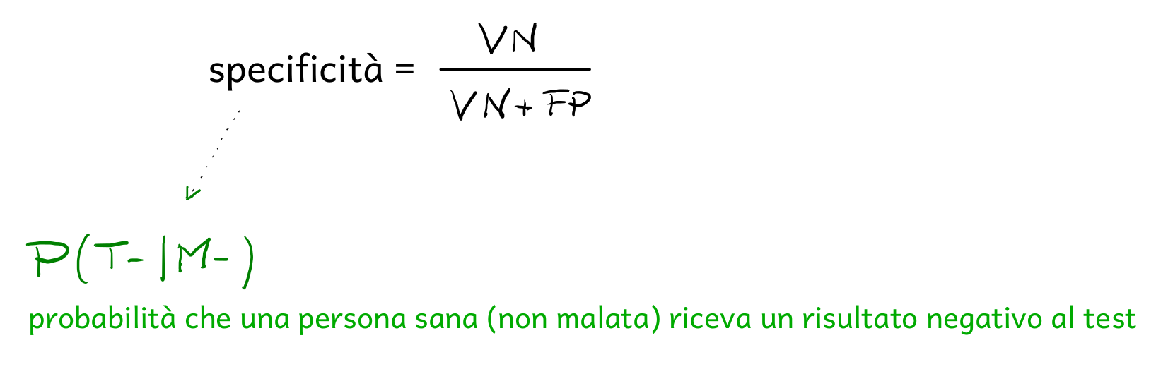La specificità di un test diagnostico indica, invece, la probabilità che una persona sana (non malata) riceva un risultato negativo al test e può essere calcolata mediante la seguente formula:
